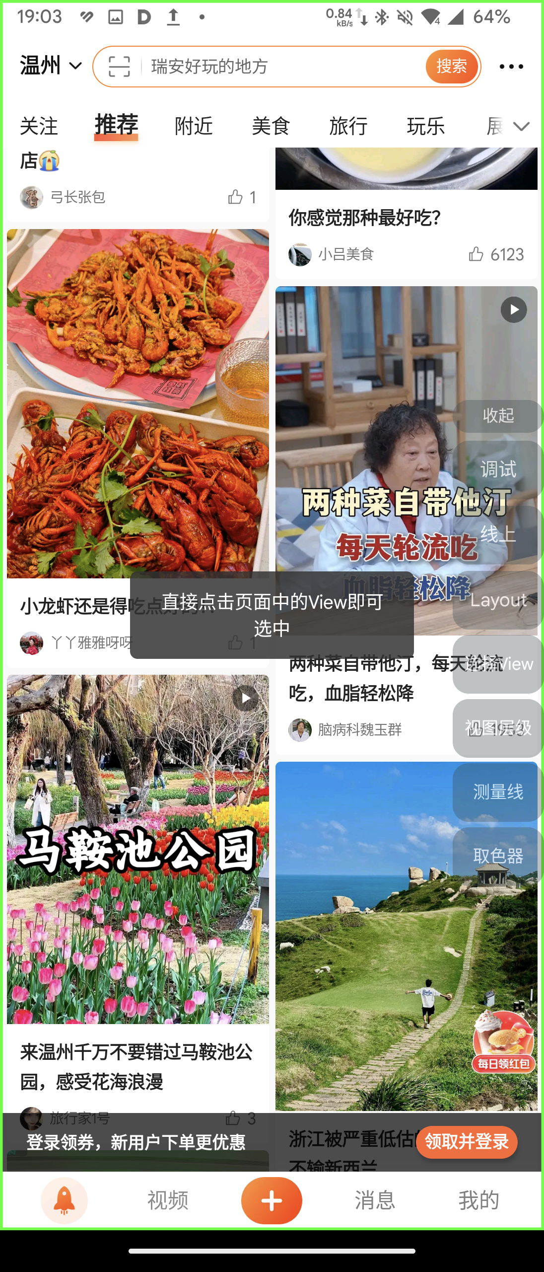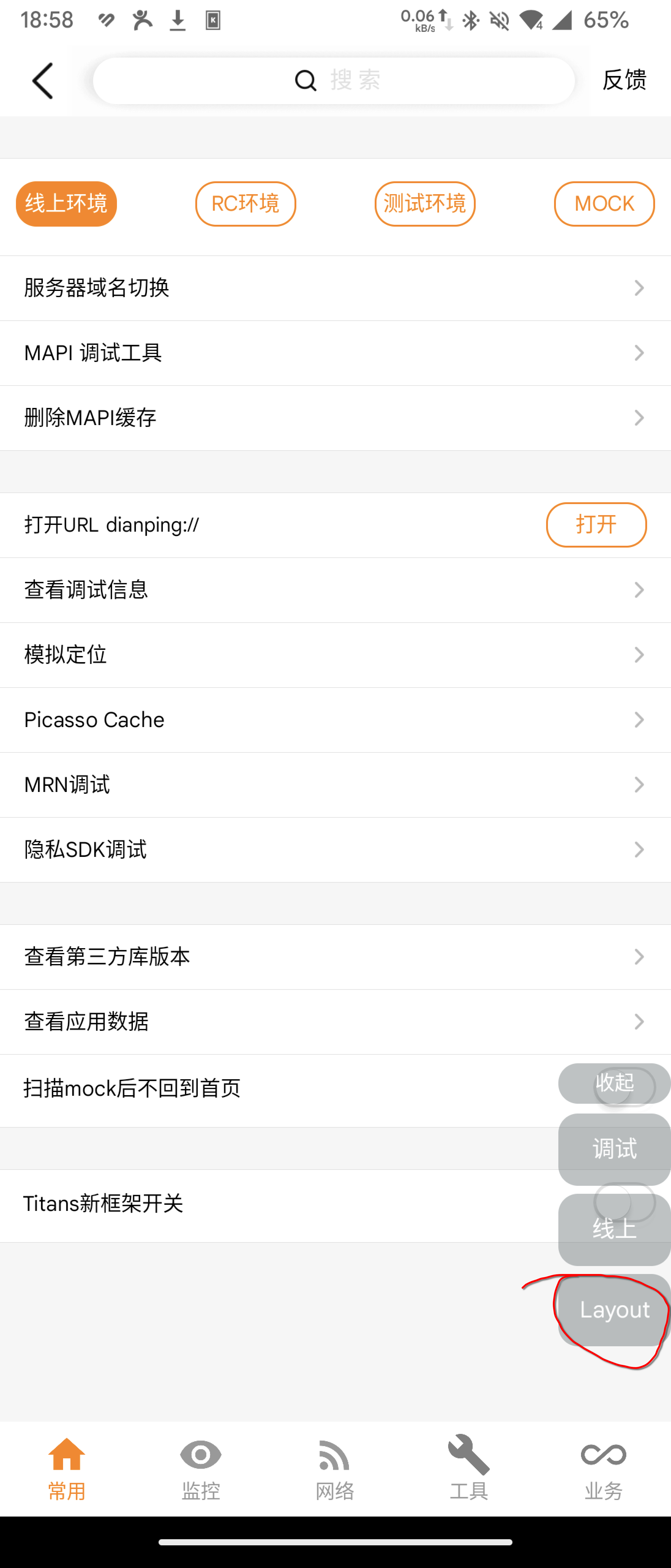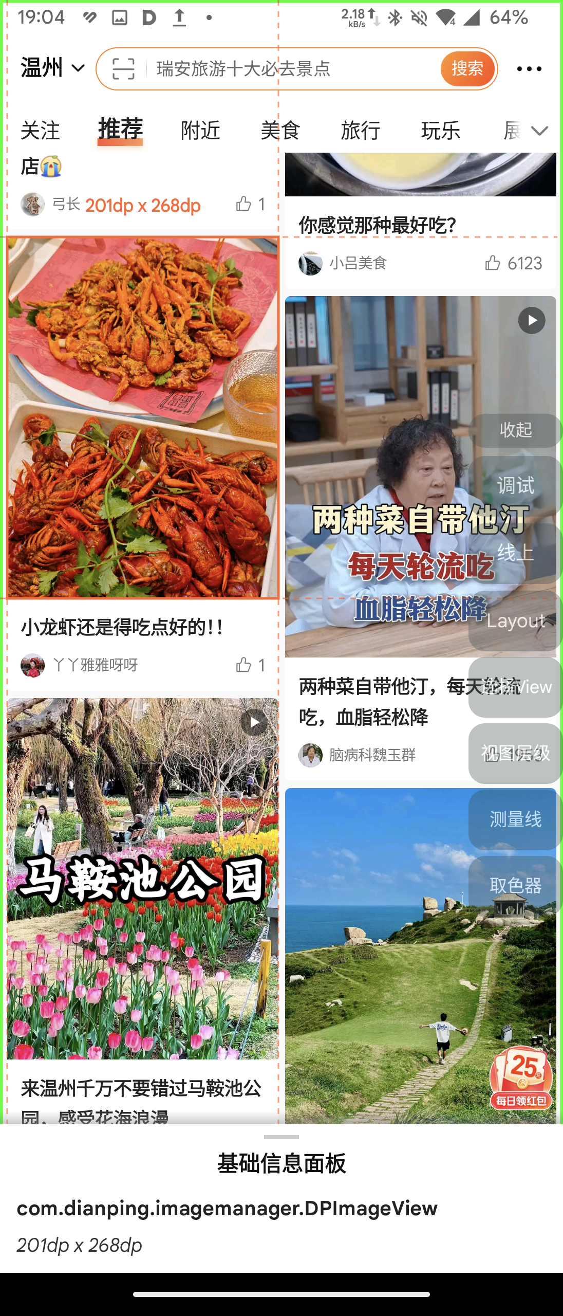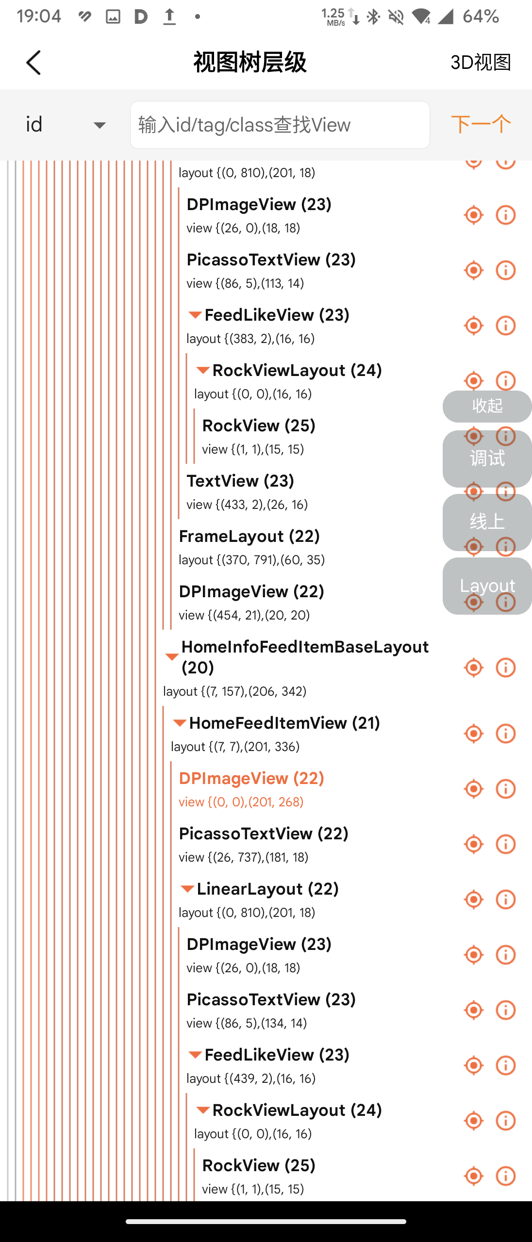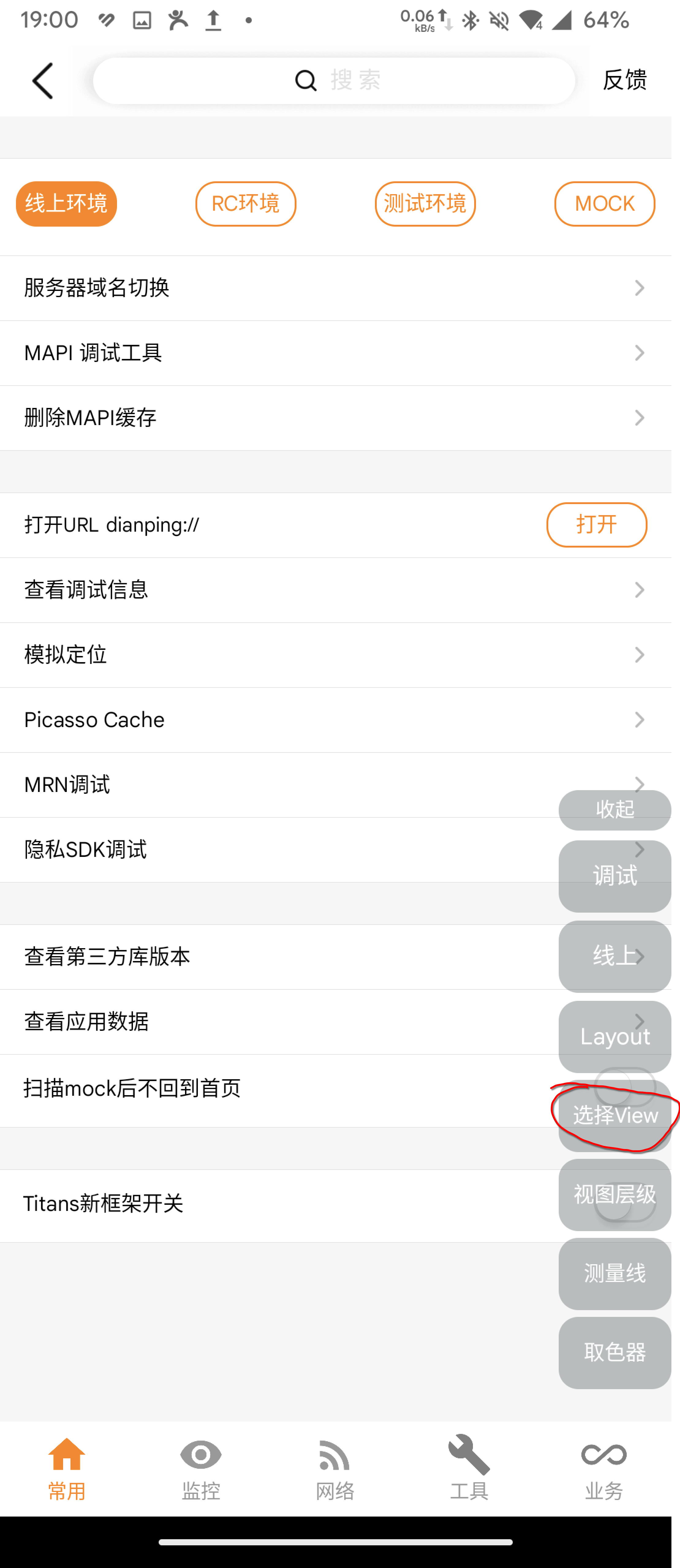 我用 创建快捷方式 (com.x7890.shortcutcreator) (用 Anywhere- (com.absinthe.anywhere_) 也行) 看了一下它的 Activity 列表,里面有一个 新工具面板 (com.dianping.debug.activity.NewDebugActivity) ,打开之和能看到许多好玩的调试选项,但最重要的是侧边吸附的调试菜单里有一个 Layout 按钮,点一下之后会有一个 选择 View 按钮。